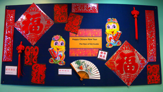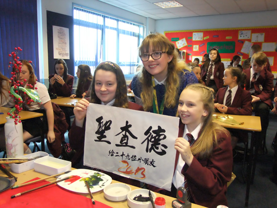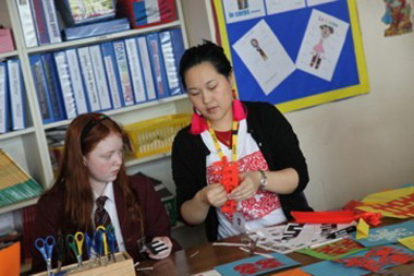 二月十一日,为了庆祝2013年蛇年的到来,在圣查德展开了一个星期的中国新年庆祝活动。新年庆祝活动由‘中国新年手工作坊’拉开序幕,当地中文老师赵奕春, 汉办老师李肖蕾和中国助教杨卉卉一起教学生们中国书法,剪纸和折纸。学生们学会了用毛笔写‘福’字和自己的中文名字,制作中国灯笼和形象逼真的各种剪纸。该 ‘中国新年作坊’ 面向全校各个年级的学生,深受学生们的欢迎。