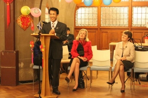 中国驻爱丁堡总领馆李瑞佑总领事、格拉斯哥大学高级副校长Andrea Nolan教授、副校长兼社会科学学院院长Anne Anderson教授及孔子学院院长Jane Duckett教授以及来自格拉斯哥及周边地区多个城市的华人与外国友人200余人欢聚一堂,共同迎接中国新年的到来。