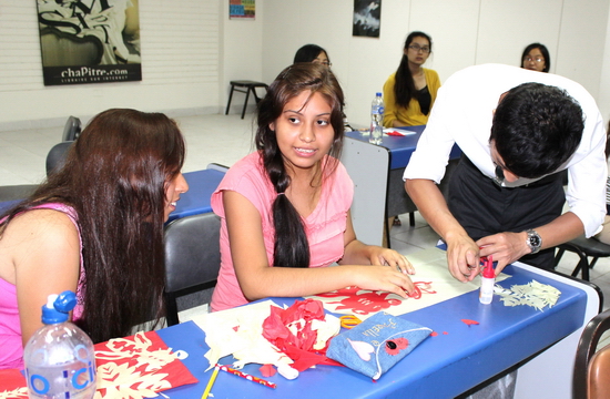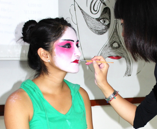 另一边的说唱脸谱也是一片欢腾,学生及当地群众认认真真地画着自己的脸谱。在介绍完这些脸谱背后的故事之后,他们饶有兴趣地来完成自己喜欢的角色。在说到关公时,一位来宾兴奋喊出:“我知道。”为了更加直观的展示油彩的独特魅力,志愿者老师当场为一位秘鲁女孩子化妆,于是又引来呼声一片。最后,大家选出最漂亮的三幅脸谱,老师为优胜者颁发奖品。大家在意犹未尽中结束了这场春节活动。
