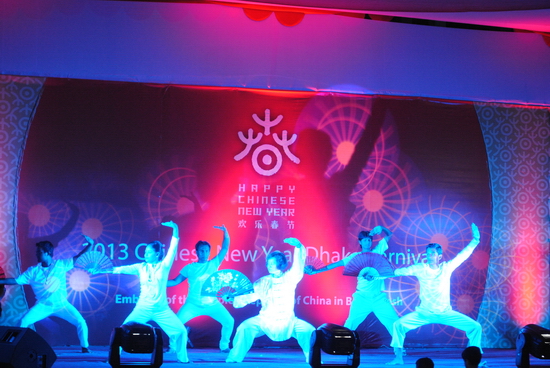 当晚,庙会专场文艺演出在《春节序曲》的音乐声中隆重上演。中国驻孟加拉国大使李军、孟加拉国工业部长巴鲁阿与中孟各界人士观看了演出。达卡各汉语教学点为观众带来了精彩纷呈的汉语与中华才艺节目。改编版小品《钟点工》展示了汉语普通话与方言的独特魅力,融合南拳、剑术、棍术、太极扇为一体的中华武术集锦使现场气氛推至高潮。孔子学院的保留节目诗朗诵《致橡树》唯美悠扬,赢得观众阵阵喝彩。