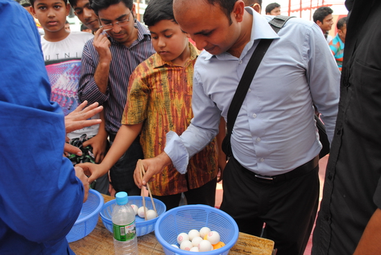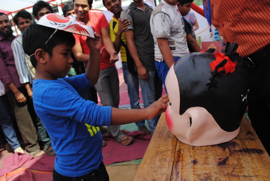 尤其吸引大家的是综合游艺区。那里人头攒动,排起了长龙。从早上庙会开场直到傍晚结束,游艺活动持续长达7小时,没有间断。套圈、猜灯谜、盲人插花、摸鼻子、双人绑腿跑等10余项游艺项目轮番上演,千余件奖品被热兑一空。颇具文化性和趣味性的游艺让孟加拉人亲身体验了中国传统习俗和文化,其参与热情让综合游艺区成为整个庙会人气最为火爆的场区。