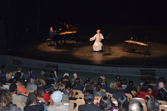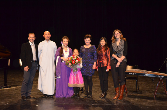 晚餐会后,中国民乐演奏会在西巴黎大学的Koltès演奏厅举行,由西巴黎大学大学校长Balaudé先生致辞开幕。旅法二胡演奏家果敢一曲《空山鸟语》,将观众带入“空山不见人,但闻鸟语声”的意境当中;果敢与法国钢琴演奏家共同演绎了法国作曲家福莱与德彪西的名曲,中西合璧的表演方式耳目一新;当场特邀嘉宾---法籍中裔小朋友Lucie走上台时,全场掌声雷动,两人合奏的中国名曲《浏阳河》,活泼欢快、妙趣横生,获得不息的掌声;最后,古筝演奏家安然与果敢丝竹合奏的《瑶族舞曲》《渔舟唱晚》等中国名段则为压轴重戏,各位来宾意犹未尽,在依依不舍离去时,他们纷纷购买相关的音像教材等纪念品。