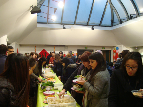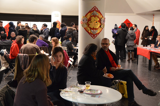下午17点半,大家翘首以盼的“过大年吃饺子”的自助晚餐会迎来300多人,红彤彤的对联、中国结、福字、气球堆砌出浓厚年味的文化中心大厅里,人头攒动。热腾腾的饺子、金灿灿的春卷、油滋滋的炒面,大家垂涎欲滴之时还不停询问孔院工作人员,比如,饺子的由来,哪种食物搭配哪种调料,想多了解一些中国饮食文化。尽管孔院精心设置了桌椅,仍不够容纳300多人同时就座用餐。大家却乐在其中,三三两两,或席地畅饮,或起坐交谈,并借机欣赏同时在活动中心展出的“印象中国”的摄影照片。美食与趣图并享,晚餐会上其乐融融。