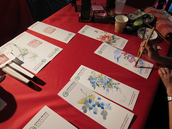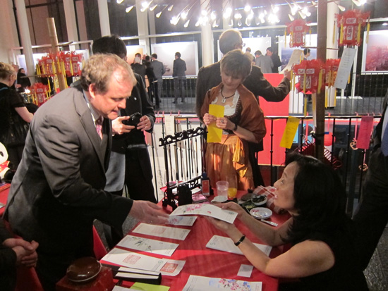 慕尼黑孔子学院作为赞助单位之一在晚会开始前就已经在大厅搭好了文化展台。红红的灯笼、五颜六色的灯谜、轻快的中国民乐一下子把来宾们带入了浓郁的中国文化氛围。周玫老师现场作画,引来嘉宾和媒体纷纷驻足欣赏。如果来宾猜对了一个灯谜,就可以从周玫老师那里得到一幅现场绘制的中国水粉画作为奖品留念。此活动深受德国朋友们的喜爱,因为中国的粉墨画色彩鲜艳,构图新颖,处处体现中国文化的魅力!一朵华贵的牡丹、一棵苍劲的竹子、一座怡人的江南小镇...寥寥几笔,顷刻间在周老师的笔下孕育而成,栩栩如生,叫人目不暇接!