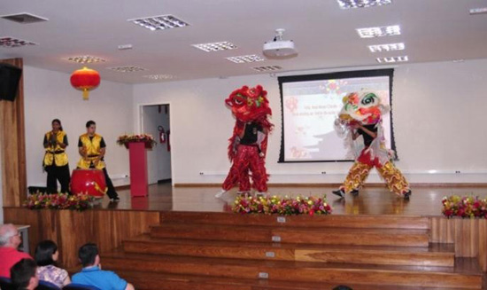 活动以富有中国特色的舞狮表演开始,之后,巴方院长保利诺教授,中方院长苏宜梅女士和经理蒂亚戈先生分别致欢迎辞。