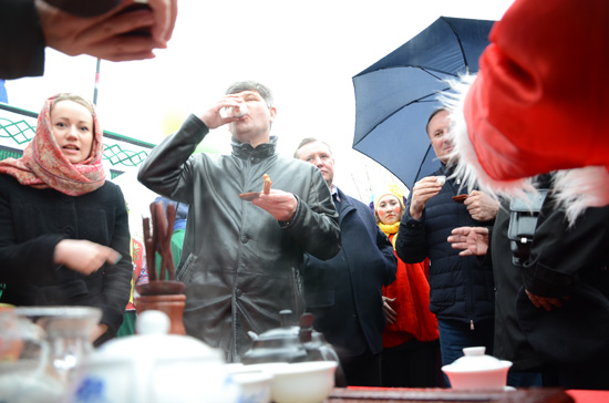 乌克兰卢甘斯克市长谢尔盖•伊万诺维奇•克拉夫琴科品尝中国茶和中国小吃
