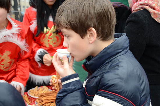 谢肉节的主要食品是俄式的发面煎饼。圆圆的煎饼象征着明亮的太阳,预示着温暖的春天快要来临。孔院老师在前一天就开始辛勤地亲手为卢甘斯克民众精心准备颇具中国特色的美味食品:麻花、散子供市民品尝,精心泡制中国茶供市民品味。很多市民都很好奇独具特色的中国食品和中国文化,前来询问这是什么并对中国味道加以称赞。他们纷纷翘起大拇指说:“中国食品很好吃,中国茶很好喝。”甚至很多家长带领孩子主动向孔院询问汉语课程、汉语学习的情况。