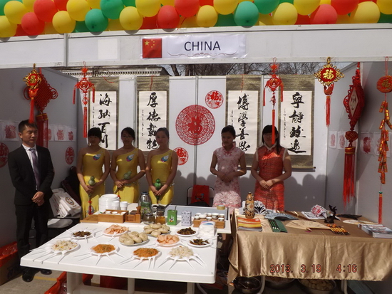 此次活动分文化美食展示与文艺表演两部分。从19日上午9点开始,各个参展国家纷纷将具有本国特色的饮食、服饰、工艺品等陈列在指定的展区内。在中国展区内,孔子学院老师和志愿者们挂起了火红的中国结,贴上了喜庆的剪纸,再配上舒雅的中国字画,浓浓的中国文化氛围幽然四溢。中华美食当然也必不可少,清香的绿茶,各色的美味菜肴早已令人垂涎不已。