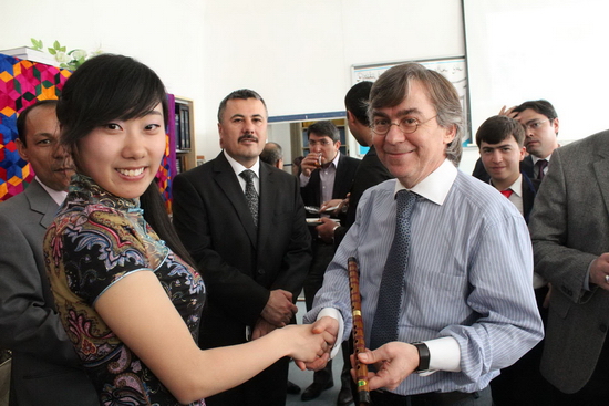 11点整,活动正式启动,应邀而来的各国使领馆代表、学生家长、客人以及杜尚别国际学校的师生们在简短的剪彩仪式之后纷纷涌入展区,开始体验来自不同国家与文化带来的美感与快乐。大家一边争相品尝着各种不同的美食,一边欣赏体验着来自不同文化的各种服饰、工艺品等等。在中国的展区前,土耳其驻塔吉克斯坦大使Mehmet Munis Dirik先生对中国的传统民族乐器笛子表现出了由衷的喜爱,他坦言自己一直对古老的中华文化情有独钟,一直想拥有一支笛子。眼见大使先生如此喜爱,孔子学院教师随即将一支笛子作为礼物赠送给他。收获了这样一份意外馈赠的大使先生兴奋之情溢于言表,他不但与中方教师合影留念,还高兴地表示,一定会将这份礼物好好珍藏。