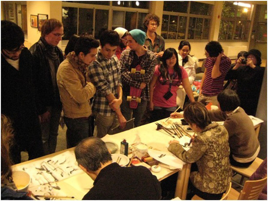 活动在西雅图大学校园XAVIER HALL 举办。灯笼、中国结、中国年节习俗文化展板、蛇年吉祥物等把现场装饰得喜气洋洋,洋溢着浓郁的中国文化特色。著名国画大师杨鸿端先生应邀带领其中美书画协会的成员前来进行了中国书画展及现场演示。美国学生被一幅幅精美的国画作品深深吸引,赞叹不已。在会场设置的中国书画体验桌,艺术家们现场挥毫,指导学生们执笔书写、作画,亲身体验中国高雅艺术。华盛顿州孔子学院欧翔英老师、赵霞老师和现代语言系的钱冬云老师现场教授学生制作中国剪纸、中国结,参与活动的美国师生反应热烈,气氛活跃。