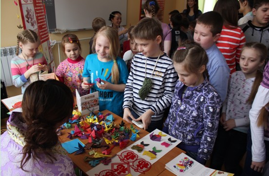 表演结束后,文化展示活动将小学生们引入了色彩缤纷的中国传统文化世界。这部分活动共分为六个展示区,分别为:茶艺展示,学折纸,学剪纸,编中国结,笛子演奏和即兴书法。六个展区同时进行,互相呼应,并在场内循环放映上述内容相关的ppt。当老师宣布表演结束,接下来进行展示时,小学生们一下子将六个展区围了个水泄不通。看着小学生们好奇的眼神,认真的学习态度,执着的等待神情,以及拿着自己心爱的作品时那种欣喜的表情,孔院的教师和前来观看的俄方小学校长、老师都感到非常的欣慰。