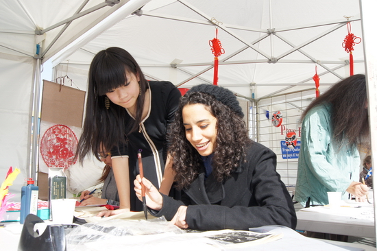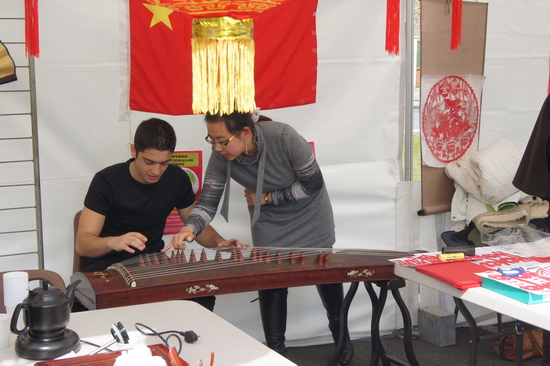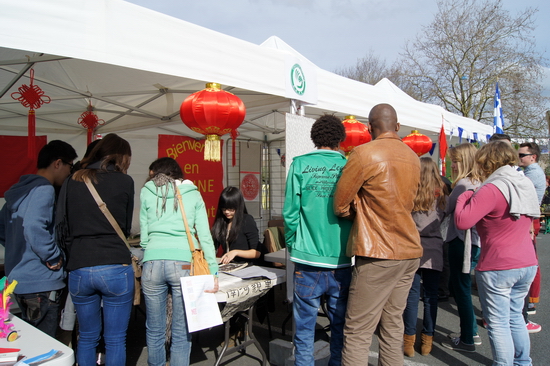 周六清晨,拉罗谢尔大学安提尼亚学生宿舍楼后面的空地上支起了两排白色帐篷,孔子学院的两个帐篷被红彤彤的灯笼和中国结映衬得十分惹人注目,帐篷内外悬挂着的写意山水画、京剧脸谱、芭蕉美人图、年年有余剪纸等极富中国元素的装饰更是引人驻足。当然,最大的亮点是在现场进行的茶艺、剪纸、书法、绘画、古筝和踢毽子的活动,特别是踢毽子,风靡全场,老少咸宜——从走路尚嫌磕绊的小娃娃到白发飘飘的老爷爷,从文静的越南姑娘到活力四射的非洲小伙子,无不折服在这中国传统娱乐项目的无限魅力下,共同体验着中华文化的绚丽多彩。