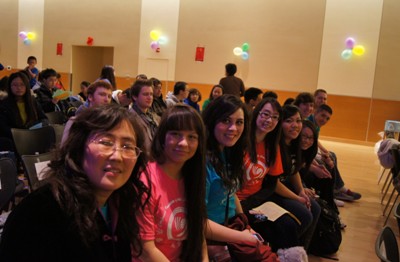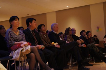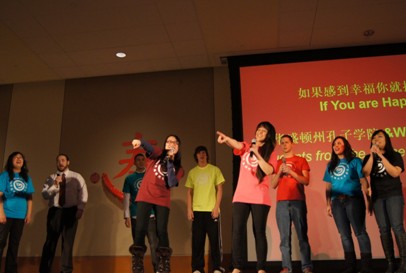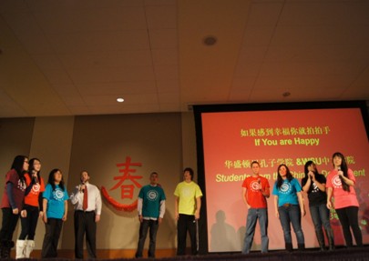 由WSU中国学生会与华盛顿州孔子学院共同主办的“华盛顿州立大学春节文娱晚会” 10号晚在华盛顿州立大学的CUB大厅举办。出席晚会的有中国驻美国旧金山领事馆的关海强领事、Pullman市市长Glenn Johnson先生、华盛顿州立大学副校长PremaArasu女士,以及中美教职工和学生近两千人。晚会上,除了中国学生表演的丰富多彩的节目以外,孔子学院也献上了节目表演唱《如果感到快乐,你就拍拍手》。参加演出的是WSU学中文的一年级学生,由美国、菲律宾、墨西哥多国学生组成的。这个节目是林晓彤老师改编并组织学生排练的。因为准备时间短,学生排练得都很辛苦。周日早上彩排,下午5点进入会场,一直到晚上九点多。当林老师和学生们身穿印“华盛顿州孔子学院”T恤出现在舞台上,观众都被吸引住了。在他们的带动下,全场观众有节奏地做拍手等各种动作,快乐的气氛充满整个大厅,把晚会推向了高潮。通过这次活动,很好地宣传了中国文化,也使学中文的学生有机会直接参与到中国文化活动中,使他们深切感受到学中文的自豪感,更有自信能学好中文。这次孔子学院师生直接登台亮相,也使更多人了解华盛顿州孔子学院。事后很多人对孔子学院的老师说:没想到在WSU有那么多人学中文,一年级的学生中文说得那么好。