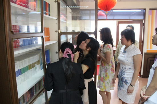 一大早,曼松德孔院全体教师身着唐装迎接着来自泰国各地的客人。近百名泰国本土汉语教师和大学生兴致勃勃地参加了开放日活动。泰国教育部基础教育委员会中文教育专员吴泰湾也到现场视察。曼松德孔院温象羽院长亲自带领客人们观看孔院汉语教学、本土讲汉语教师培训和中国文化交流等活动的图片专栏,介绍曼松德孔院与下属5个教学点及7个HSK与YCT考试考点以往的教学活动和考试情况,孔院教师们则分别与来宾开展汉语文化交流。