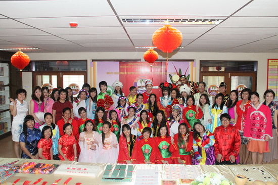在“一日中国”开放日,客人按要求一进门就进入文化室试穿漂亮的中国唐装和民族服装,并需要用标准汉语沟通才能陆续参加其他项目。大家纷纷身着中国服装在孔子像前合影,纪念这一难忘时光。曼谷市的余柳金(Mrs.Liugim Jirataranon)老师虽然年纪大,当她穿上一身满意的中国少数民族服装拍照时,激动地对孔院老师说:“老师,我能不能多拍几张,回去给我老公也看看?”到活动中程, 穿中国服装讲汉语已经成为大家共同认可的时尚。