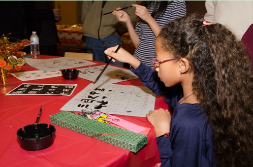 为贯彻老少同乐、中外同乐的晚会宗旨,借新春晚会之机更好的宣传中国文化,孔子学院精选了包括写春联、状元锣、猜灯谜、夹筷子、乒乓球等中外友人乐于参与又能代表中国传统文化的活动作为晚会的一部分,深受中外客人的喜爱。很多美国客人在春联桌前一试身手,模仿书法老师写下新春的祝福;彩灯下人头攒动,享受着灯谜中的玄机与猜出灯谜后的喜悦;客人们在乒乓球桌前一比高下,完美的弧线更是架起了中外友谊的桥梁;其中,筷子夹彩珠最受中外客人的青睐,客人们几人一组比试着用筷子的娴熟,当然对于更多的美国友人来说是一种学习实用筷子的经历。