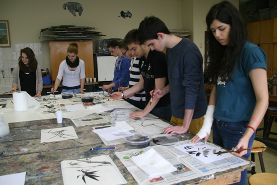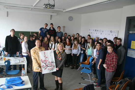 这次德国之行,蔡先生在短短的一周时间里,分别在纽伦堡和埃尔朗根周边的五所高中和纽伦堡的成人教育中心举办了个人讲座,并在教育总署展出了他带来的中国画作品,并举办一场现场创作表演,之后把作品分别赠送给了纽伦堡教育总署和孔院。在六场讲座上他深知互动的作用,一边创作一边讲解中国画的技法和理念。中国国画的经典题材“花中四君子”——梅、兰、竹、菊,在蔡立群先生的笔下栩栩如生。他用单纯的水墨和清淡野逸的笔致,生动地传达出了梅花的清肌傲骨,兰花的幽芳高洁,竹子的挺拔劲节和菊花的凌霜自行。参与讲座的学生们看完蔡先生的演示之后纷纷赞叹中国水墨画的神奇,带着好奇和期待他们也开始画了起来。可是像蔡先生一样挥毫自如,下笔有神是每个初学者都无法企及的,水与墨的比例和下笔的轻重、快慢是水墨画的精髓也是考验。在反反复复的看与画的过程中,他们越来越有兴趣,越来越有成就,在理论和实践上对中国画的认识也越来越深。