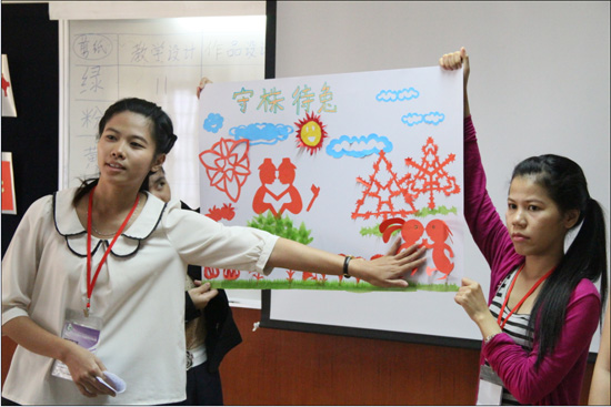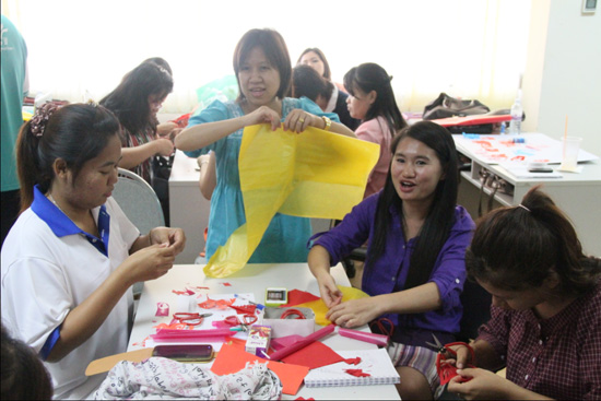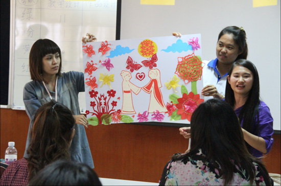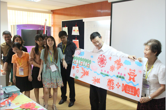 4月10号,29位曼松德孔院下属教学点的本土汉语教师来到曼松德孔院学习剪纸。这次剪纸课,授课老师根据泰国中小学的教学需求大胆创新,打破了传统的学生紧跟老师一步一步剪的授课方式,而是在充分训练剪纸基本折纸方法、剪纸基本元素图案的基础上,生动讲述经典中国成语和故事,按照成语和故事让学员自己发挥想象力、协作和动手能力,分组限时完成一件剪纸作品。