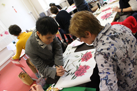 葛先生此次雷恩之行,不仅来展示自己的水墨作品,他还应邀前往左拉中学为学习中国画的中学生授课。同时,他还受邀在孔子学院绘画课堂为当地学习中国绘画的学生讲课指导,受到了学生们的热烈欢迎。另外,葛晓弘先生及孔院的中外方院长还将受雷恩二大艺术学院院长的邀请到艺术系作进一步的学术交流。