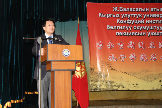 2013年4月8日当地时间10:00,由吉尔吉斯国立民族大学孔子学院举办的 “孔子学院名人讲坛” 系列讲座活动,在吉尔吉斯国立民族大学大礼堂隆重开讲。此次活动旨在为各领域专家搭建良好的学术交流平台,为比什凯克的大学生提供了与专家学者探讨当今中国发展的机会。“孔子学院名人讲坛”共邀请了9位中吉两国知名专家学者开展系列讲座。各位专家就中吉政治政策、经济形势、教育特点、历史联系、文化影响等多个方面,对学术界广泛关注的中吉热点话题加以解析。