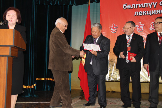 开讲仪式上,Исамидинов Искендер校长代表吉尔吉斯国立民族大学孔子学院,分别向此次讲坛的国家级专家颁发了“孔子学院名人讲坛”主讲人聘书。他们是:上海合作组织前秘书长Иманалиев М.С.先生、吉尔吉斯前驻华大使国家二级总统顾问Саралинов М.先生、吉尔吉斯斯坦国家议员国家教育科学文化体育委员会主席Осмоналиев К.先生、吉尔吉斯科学院副院长Акматалиев М.А.先生、吉尔吉斯文化杰出贡献奖获得者著名诗人Акматбекова С.女士、吉尔吉斯著名学者人民作家Жакшылыков先生、吉尔吉斯知名中国领域问题研究专家Дононбаев А.Д先生,以及孔子学院吉方院长语言学博士Култаева Умут女士。