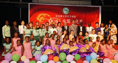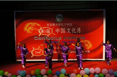 2013年5月2日下午两点,由拉各斯大学孔子学院举办的尼日利亚第二届“中国文化月”开幕式在拉各斯大学艺术剧场举行,来自中国驻拉各斯总领馆、各路媒体和拉各斯大学孔子学院教学点等多方代表及华人代表出席并观看了开幕式表演。
