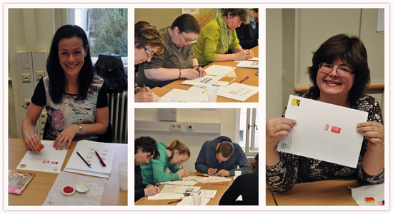 最后,所有现场学员的作品都印在一张有格拉茨大学孔子学院标识的白纸上,由孔子学院收藏。每位参与者都通过他们的亲身体验进一步了解了篆刻艺术,也加深了对中国传统文化艺术的热爱。