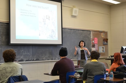肯大孔院的活动阵营设在主教学楼,孔院教师为此次活动精心准备了四个专题,分别是:中国茶艺、中国书法、中国武术和汉语体验。首先登场的是中国茶艺专题,欧昱兰老师首先通过幻灯片介绍了了中国茶的发源、种植、采摘、制作和冲泡,接着简略地介绍了中国茶的分类和功效,并向听众展示了中国绿茶、红茶和乌龙茶样品。现场的茶艺表演将该专题活动推向高潮,观众们对考究的茶具、优雅的茶艺和芬芳的茶香啧啧称赞,更对其深刻的文化意蕴倍感向往。接着亮相的是曾奇斌老师主持的中国书法展示和体验课。曾老师首先通过投影向体验学员们演示了“永”字的写法,让他们对汉字的基本笔画和书法的运笔方法有初步的认识,再在水写纸上练习。之后,学员们开始在宣纸上书写“龙”、“虎”、“乐在其中”、“道”等具有特定中国文化含义的字句,让美国人民由浅入深、由表及里地对中国文化艺术有了初步的认识。周玉芳老师的中国武术体验专场是本次文化活动最大的亮点。肢体动作的教学最能有效地获得美国学生的共鸣。周老师带领学员们打了一套长拳的短套路,几番练习之后个别学生便能记住基本动作。此外,学员们还体验了功夫扇、太极八段锦。时间似乎在这里过得特别快,课程时间早已结束,学生们依旧兴致盎然,在离开的时候仍然恋恋不舍。在汉语体验课上,林莺老师不仅教给学生们诸如问候、打招呼等简单的汉语对话,还设计了丰富有趣的课堂活动,寓教于乐。