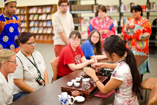 中国传统茶艺展示活动将中国文化带入了西肯塔基大学校园。此次茶艺展示活动由汉语俱乐部主办,孔子学院提供资助和服饰。2013年4月24日,星期三,学生们身着盛装在Helm图书馆进行了茶艺表演。在中国文化中,茶艺讲究艺术、优雅与和谐。它非常注重茶本身,尤其是不同茶的芳香和口感。通过这次茶艺展示,学生们了解了茶的养生作用,以及茶艺中所蕴含的平和宁静的哲学。
