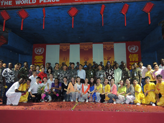 4月19日下午,艺术团前往中国驻利比里亚维和部队进行慰问演出。整场演出高潮迭起,掌声雷动,气氛热烈而感人。演出结束后,维和部队的全体官兵用整齐划一的军姿向巡演团和孔子学院表示衷心感谢。