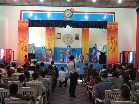 蒙罗维亚市政厅演出现场(后排左七、左八分别为利比里亚总统瑟利夫和中国驻利比里亚大使赵鉴华)