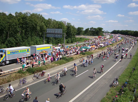 2010年7月18日是鲁尔地区民众喜庆的日子。这天艳阳高照,蓝天白云,是欧洲文化之都“宁静生活”活动的理想之日,超过三百万的欧洲人正在穿越德国鲁尔工业区的A40高速公路上狂欢。今天的A40高速公路从杜伊斯堡到多特蒙德段60余公里的路程一改往日车鸣笛扰、风驰电掣的忙碌,迎来了悠闲的步行者和欢畅的自行车骑手。两万多张餐桌拼成了世界上最长的宴席,市民可以在此复制他们的生活场景:唱歌、跳舞、聚会,亦可以展示他们自己的民俗和文化。