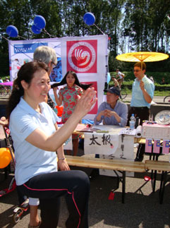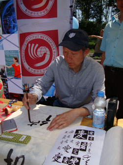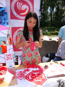 欧洲人对如何用中文书写自己的名字十分好奇, 孔子学院的许宽华院长就为观众解释其名字的中文含义,并用毛笔写在宣纸上赠送给他们;教师冉小群则和着典雅的中国古筝乐曲打起了太极拳 ,不少游人观众不仅聚精会神地观看,而且手中照相机、摄像机的拍摄一直都没有中断过。不光是成年人在孔子学院的展台前流连忘返,孩子们也在这里找到了中国式的乐趣。身着亮丽旗袍的志愿者唐静瑶,灵巧地转动着手里的剪刀和红纸。引得排队等待剪纸礼物的孩子们一个个都目不转睛地看着。不一会儿,精美的蝴蝶、熊猫、红双喜、小女孩等图案的剪纸作品就都被孩子们领回家了。孔子学院为观众们准备的山楂糕、印子糖等中国糖果,其受欢迎程度也非常高,半小时之内就被品尝一空。