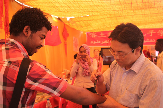 展览上,孔子学院展位人头攒动,由孔子学院教师和志愿者表演的茶道、太极拳、民族舞蹈等吸引了众多医学院学生和汉语爱好者驻足观看。另外,孔子学院还结合医学院专业实际,在展出许多优秀汉语教材同时,展出了一批关于针灸推拿等中国传统医药、疗法的读物,让这些未来苏丹的医务工作者们接触并了解了中国古老又神奇的中医。