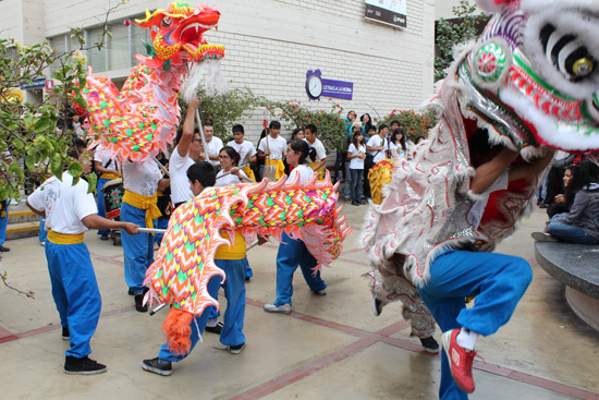 随着优美的中国音乐变成了锣声鼓点,只见一条金龙由远及近摇头摆尾游来。它全身五彩缤纷,在人群中时而沿8字穿行,时而腾空环绕,姿态十分灵活。仔细一看,托举它的竟是7个当地面孔的年轻人。爆竹声里,一只大白狮和另外两只黄狮眼睛忽闪着,神气活现地出现在观众面前,和观众互动。舞狮人手法熟练,步伐矫健,情绪昂扬。周围人头攒动,观众的目光被紧紧地吸引了,不时报以热烈的掌声。