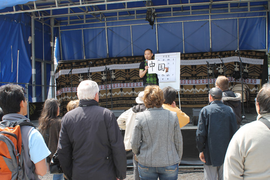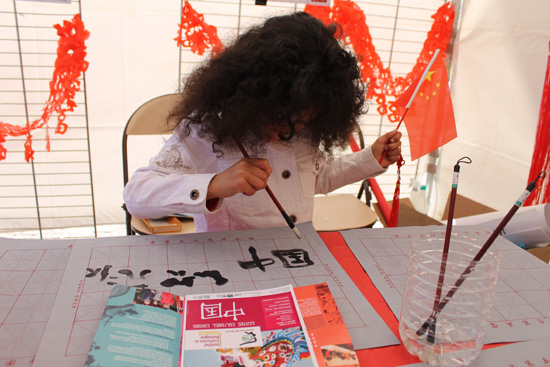 下午两点,活动正式开始。孔子学院的汉语教师薛君在广场的临时舞台上带领现场观众体验了一把学习汉语的乐趣。他用手势指挥大家一遍一遍练习汉语的语调,还教大家学习了简单的日常会话。在老师的带领下,现场的观众大声读出了“我爱中国,我爱学汉语”的句子。汉语体验公开课过后,大家又来到孔子学院展区,一边品尝中国香茗,一边体验学习中国书法。值得一提的是,前来学习和体验书法的不仅有大人,还有大学生和小孩子,很多小孩子对写汉字表现出了浓厚的兴趣。最后,每一位从汉语展区离开的观众都获得了一面中国小国旗或中国结作为纪念。