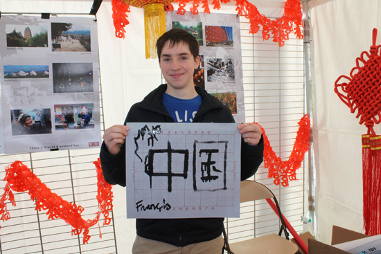 孔子学院展区以中国红作为主色调,现场有飘扬的五星红旗、有充满浓郁中国特色的红灯笼、大大的红色中国结、以及红色的福字剪纸拉花,还有红色春联,整个中国展区装扮得既喜庆又醒目。展区里还又一次展出了不久前孔院举办的摄影比赛获奖作品,以便让更多的市民了解中国的风土人情和发展变化。展区的后墙上,还悬挂起了两张精选的中国国家汉办赠送的汉语教学有声挂图、一张中国版图、中华人民共和国国歌歌词及一张汉字偏旁与部首挂图。