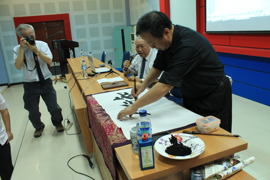 Burhan教授及哈山努丁大学孔子学院中方院长祝小军致辞对远道而来的教授们表示热烈的欢迎后,由周平远教授、王德保教授、杨雪骋和张芳霖教授分别向观众讲授了孔子的艺术教育理念、景德镇与瓷器、禅学与书法人生等内容深刻、发人深省的中国文化,杨雪骋教授还展示了他精湛的书法功力,现场题字“知行合一”赠与孔子学院。