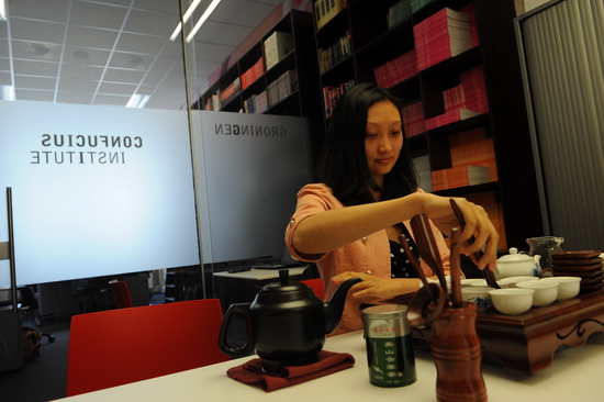 下午2点,成教授专门参观了格罗宁根孔子学院,并与全体教师和学生代表进行了座谈。格罗宁根孔子学院中方院长刘婧一主持了此次活动。活动以中方教师志愿者张笛的茶艺表演开场,随后刘婧一院长向成教授和媒体记者介绍了孔院的情况:“孔子学院承担着帮助世界了解中国的使命,格罗宁根孔子学院致力于向格罗宁根乃至整个荷兰和德国西北部推广中文教育、中国文化,也希望帮助同中国打交道的荷兰和德国企业了解中国文化。”她高兴地告诉成教授, “一些荷兰企业也认识到了解中国文化的重要性,已经有越来越多的企业主动邀请我们为他们提供中国文化和商务汉语的培训”。