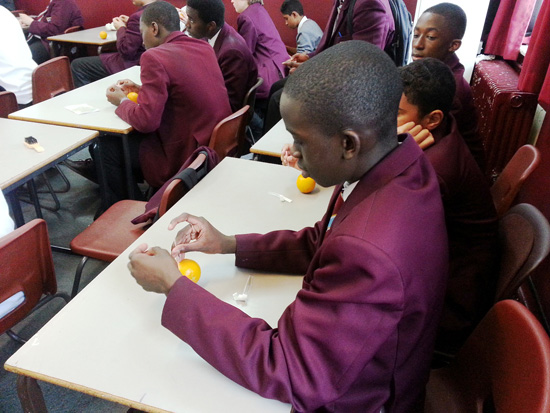 一名英国学生专心致志得尝试在桔子上针灸