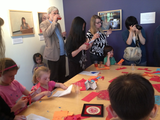 孔院的剪纸展示和互动,立刻吸引了无数的目光,有很多小朋友饶有兴致地学习如何剪灯笼、喜字和虎头,家长们更是在一旁加油,或忍不住自己动手加入了进来。孔院老师知道时间有限,为了留给大家练习的机会,特地在彩纸上印制好图案,并配有说明,供观众们带回家,继续剪纸的快乐。准备的近80份素材,被一扫而空。