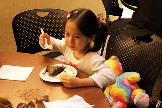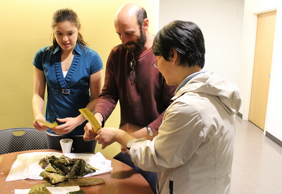 随后,孔子学院献上了汉语教师提前准备好的几百只精美香糯的粽子,邀请大家共同品尝。有些家庭扶老携幼,在一片粽香中聊解乡思之情。孔院教师还现场示范如何包粽子,引得观众跃跃欲试,踊跃参加,并把亲手包好的粽子带回家。