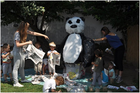 孩子们自己动手用旧报纸制作纸扎熊猫。