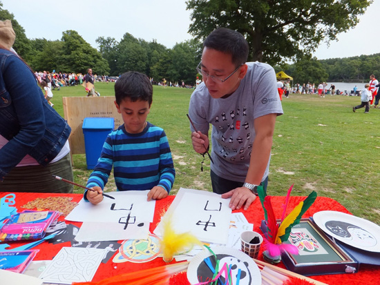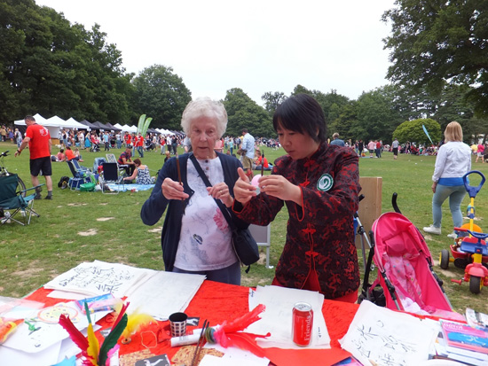 一年一度的龙舟节在克劳利的迪尔加特公园举行。本届龙舟节吸引了来自波音、英航等三十支代表队,活动当天有近千人参加。经过精心的策划和认真的准备,伦敦中医孔子学院在中国城展位组织的活动精彩纷呈,引人入胜,成为最受游客欢迎的展位。龙舟节上午10点开始,伦敦中医孔子学院首先安排了与龙舟节主题巧妙结合的手工工作坊,教游客尤其是孩子们做纸龙舟、龙冠。随着活动的开展,又进行了书法和中国结工作坊。期间还穿插了踢毽、吹气球等游戏,成为最受孩子们欢迎的展位。在教游客用毛笔写汉语名字的环节,展位前一度排起了长队。男女老幼都来参加,最小的两三岁,最年长的80多岁。其中还有一位孕妇饶有兴致地用毛笔写下了腹中婴儿的中文名字。