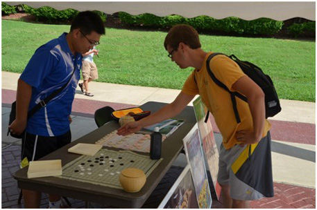 “中国文化节”活动包括三个主要部分:展示部分,文化体验部分,以及信息咨询部分。展示部分由四块展板和中国文化展品组成。展板上展示了由中阿肯色大学孔子学院举办的各种中国文化活动和中文项目的照片,如“汉语桥”比赛,阿肯色高中生中国夏令营,阿肯色教育团中国行,中文俱乐部,上海汉语暑期学习班,等等。通过照片展示,参加者对于丰富多彩的中文活动有了直观的了解。除此之外,各式中国文化展品,如茶艺、竹简、京剧面具、传统乐器、围棋、传统游戏、宫灯、中国结等,吸引了很多人前来观看。通过孔院老师的解释,学生们对中国文化开始产生兴趣,并且试着动手体验。