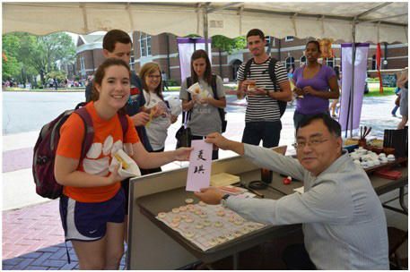 在文化体验部分,参加者可以得到一个中文名字,并由中阿肯色大学孔子学院院长庄国欧博士用毛笔书写在彩纸上。他们对此表现出极大的兴趣,都纷纷赞叹中文名字和中国书法“很酷”,有的还表示会将中文名字装裱起来,或者贴在宿舍门上。当然,春卷和煎饺这样的中国小吃也吸引了很多学生。