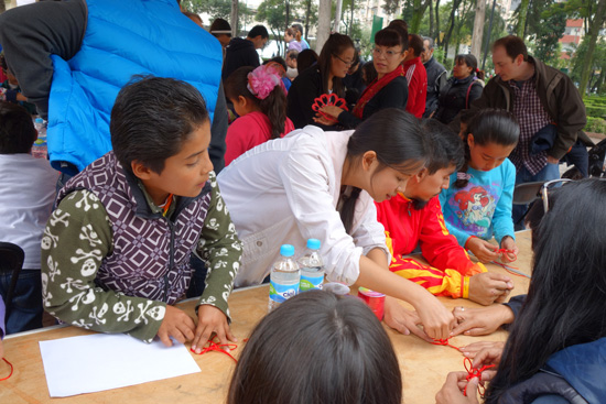 开幕式后,文化节上的各项文化活动全面启动。在中国文化体验区,墨西哥城孔子学院的老师们在现场开设了各式各样的文化教学课,其中包括制作中国结、剪纸、写书法、画脸谱等,多样的文化、生动的课堂吸引了许多当地群众前来观看并亲身参与体验。只见这些临时的“学生”们一批一批地拥到课桌边,认真地跟着老师一起学习中国传统手工艺,最后都能带着自己的成果满心欢喜地离开。此外,墨城孔院的老师们还为当地群众准备了十二生肖的相关介绍,并现场帮他们找出生肖以及写中文名字,这一项活动也得到了当地群众特别的青睐。