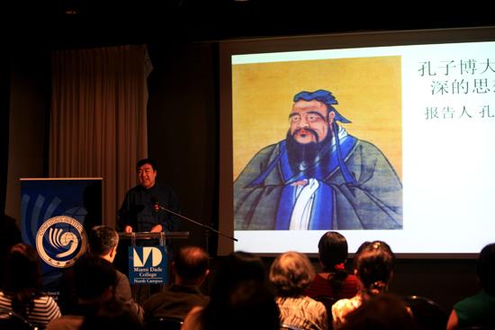 9月14日下午,孔子的第75代玄孙、世界儒学大会秘书长、中国孔子研究院研究员孔祥林教授为当地华人社团、中文教师协会、社区居民及该校师生在北校区的阶梯教室5116室作了题为“孔子博大精深的思想”的学术报告。该讲座是迈阿密达德学院孔子学院名家讲坛的第五讲,由孔子学院美方院长余学钧博士主持。孔祥林先生在两个小时内着重讲解了孔子的政治思想和伦理思想,并引用孔子著作、配以名画插图在尊崇周天子、以德礼法治国、施行仁政、富民教民、举贤才等方面阐释了孔子的政治思想。在讲座的最后环节,他与现场观众互动交流。听众们纷纷表示,孔先生的讲座信息含量大,国学功底深厚,讲解深入浅出,有助于领会孔子博大精深的思想。