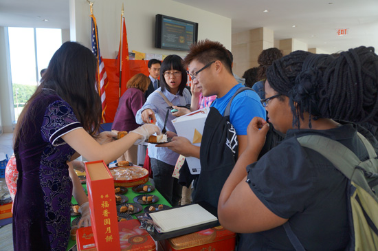 麻州大学波士顿孔子学院为师生精心准备了六个大型蛋糕和各种馅料的数百份月饼。志愿者们身穿精美旗袍,和麻州大学波士顿校区副校长、孔子学院院长Kathleen Teehan、孔子学院中方院长刘成运一起,将一块块蛋糕和月饼分发给参与活动的师生和民众,向他们介绍中秋节这一中国的重要传统节日,介绍孔子的主要思想,还介绍孔子学院的主要工作以及在世界各地的蓬勃发展。为了加深大家对中秋节和孔子的了解,麻州大学波士顿孔院专门印制了彩页,详细讲述有关中秋节的优美传说、神话故事,阐释孔子的主要贡献和思想。