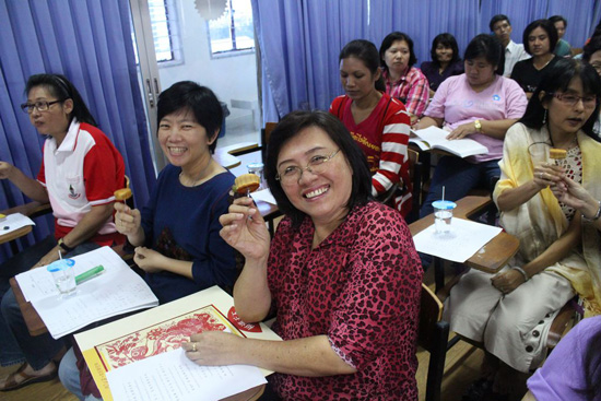 孔院公派教师王玮副教授以图文并茂的PPT向在场的听众讲解了中秋节的由来、嫦娥奔月的民间传说,并放映了精彩视频辅助讲解。赏月、拜月、吃月饼、玩花灯、合家团圆等不同地方的习俗让大家也产生了情感上的共鸣。学员兴致盎然,认真记笔记,并主动向老师提问中国的中秋节与泰国的祈月节有什么不同。在有奖互动问答的环节中,在场学员都积极踊跃回答问题,现场气氛十分热烈,曼松德孔院准备了精美的中国结和剪纸作为奖品赠送给获奖学员。在了解中国传统文化的同时,曼松德孔院为所有在场学员准备了美味可口的月饼。最后,孔院教师教授了中国歌曲《但愿人长久》,许多学员对此曲的旋律并不陌生,但在孔院教师解释了这首词的含义之后,大家才真正被这首词中“但愿人长久,千里共婵娟”的美好祝愿深深打动了,一起打着拍子唱起了歌,现场气氛被推向高潮。在优美的歌声和动听的旋律之中,大家依依不舍地道别,学员们与孔院约定明年的中秋节还要聚在一起团圆。
